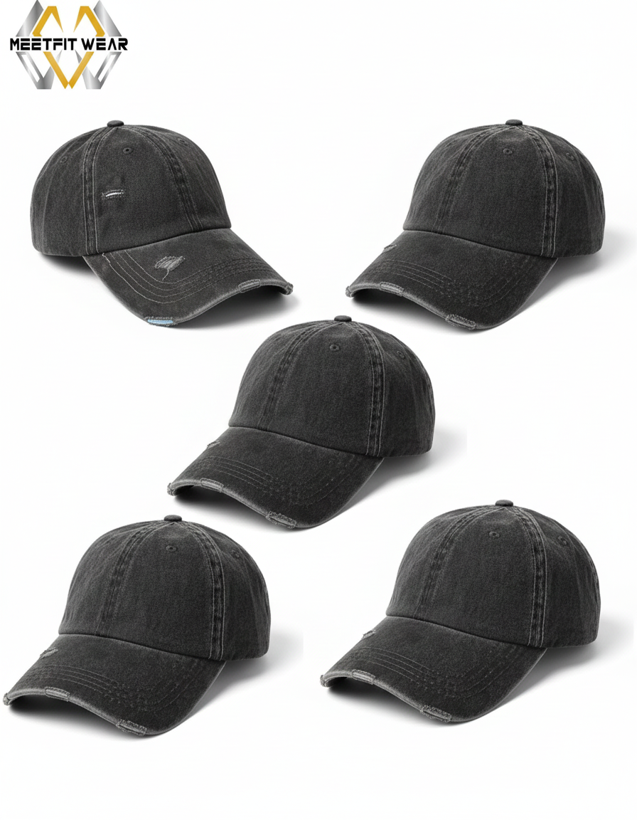 Top off your street-ready look with the Meetfit Wear Distressed Denim Cap. This six-panel essential blends rugged urban utility with a timeless vintage aesthetic, making it the perfect final touch for any modern wardrobe.