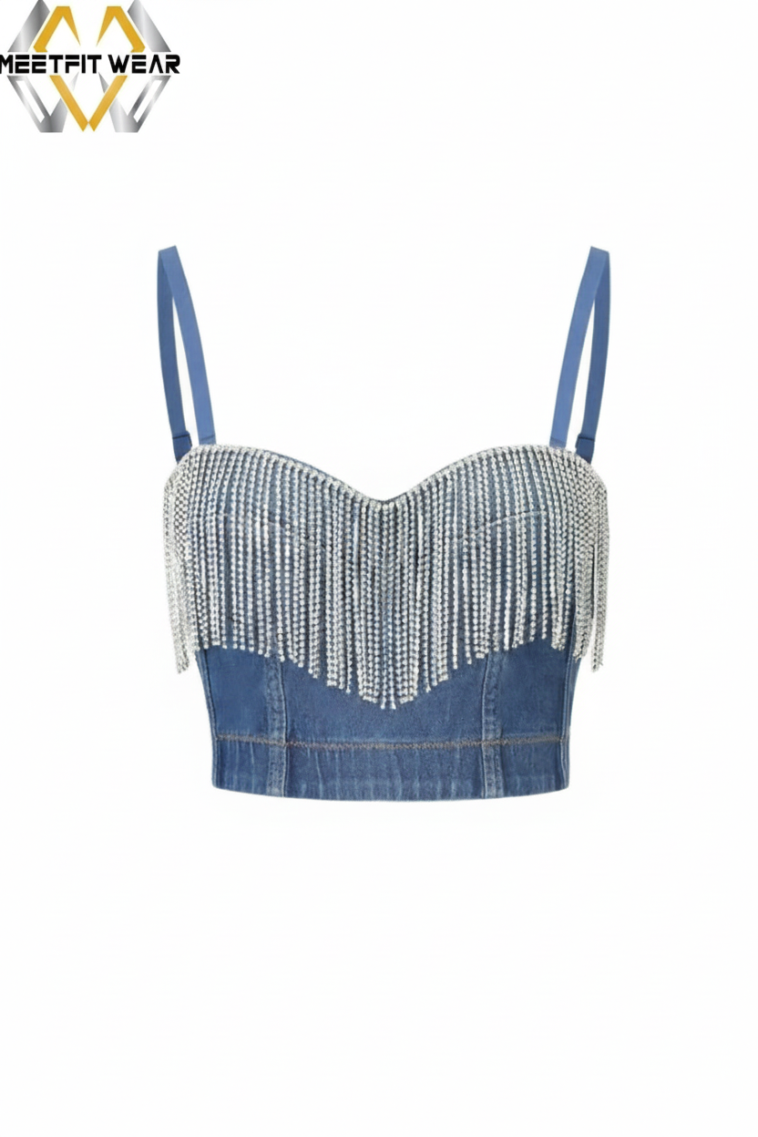 Step into the spotlight with this statement-making denim crop. Featuring a classic sweetheart neckline and dazzling crystal fringe, it’s the ultimate fusion of rugged denim and high-shine elegance.