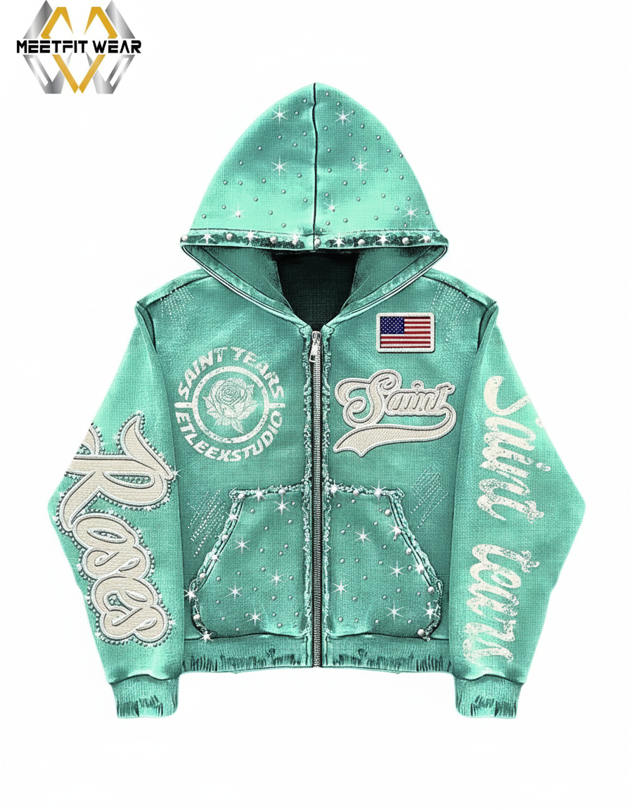 Step into the spotlight with this premium teal zip-up hoodie, designed for those who embrace high-fashion streetwear. Featuring intricate embroidery, sparkling rhinestone accents, and a vintage-wash aesthetic, this piece is the ultimate blend of luxury and urban grit.
